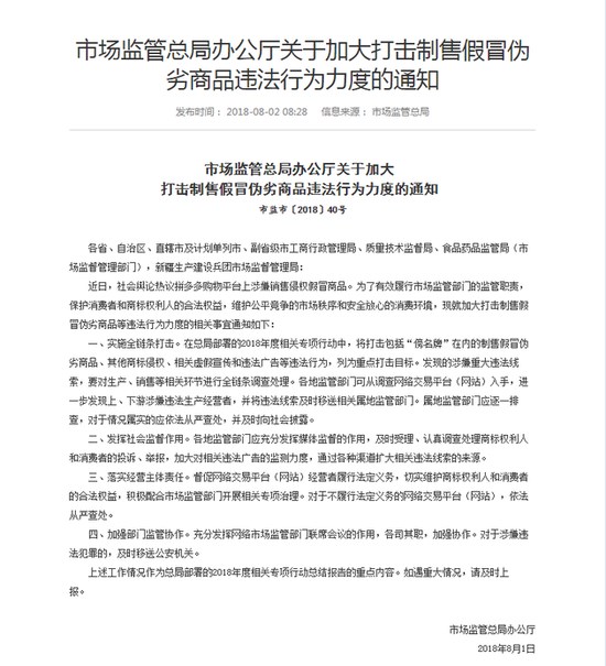 今天市场监管总局官网发布消息称,近日,社会舆论热议拼多多购物平台上涉嫌销售侵权假冒商品。为了有效履行市场监管部门监管职责,保护消费者和商标权利人的合法权益,维护公平竞争的市场秩序和安全放心的消费环境,现就加大打击制售假冒伪劣商品等违法行为力度的相关事宜通知如下: