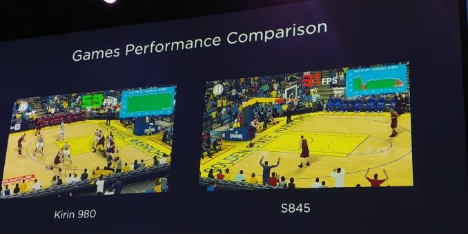首先对比的游戏是《NBA 2k18》,麒麟980的平均帧数是59.32帧,而骁龙845虽然平均帧数也有51.81帧,但是稳定性上与麒麟980差距较大,最低降到了31帧。